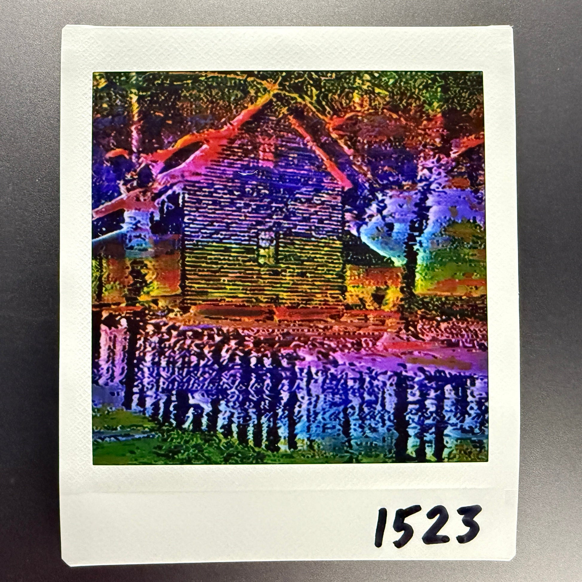 glitch prints are on instax square film, which is similar to classic polaroids. the image is 62mm x 62mm. the border is 72mm x 86mm. the colours will vary slightly, as the glossy finish is hard to photograph. every one is one of a kind, and will not be reprinted.