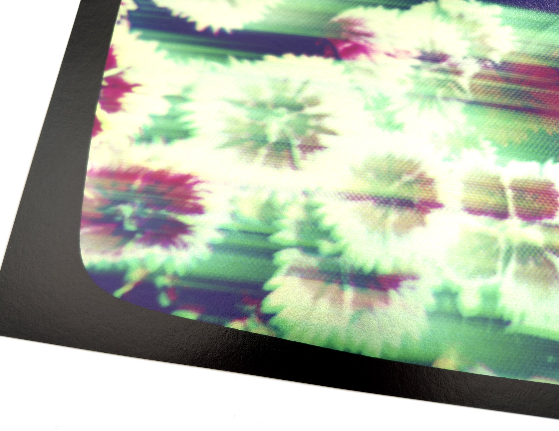 glitch prints are on instax square film, which is similar to classic polaroids. the image is 62mm x 62mm. the border is 72mm x 86mm. the colours will vary slightly, as the glossy finish is hard to photograph. every one is one of a kind, and will not be reprinted.