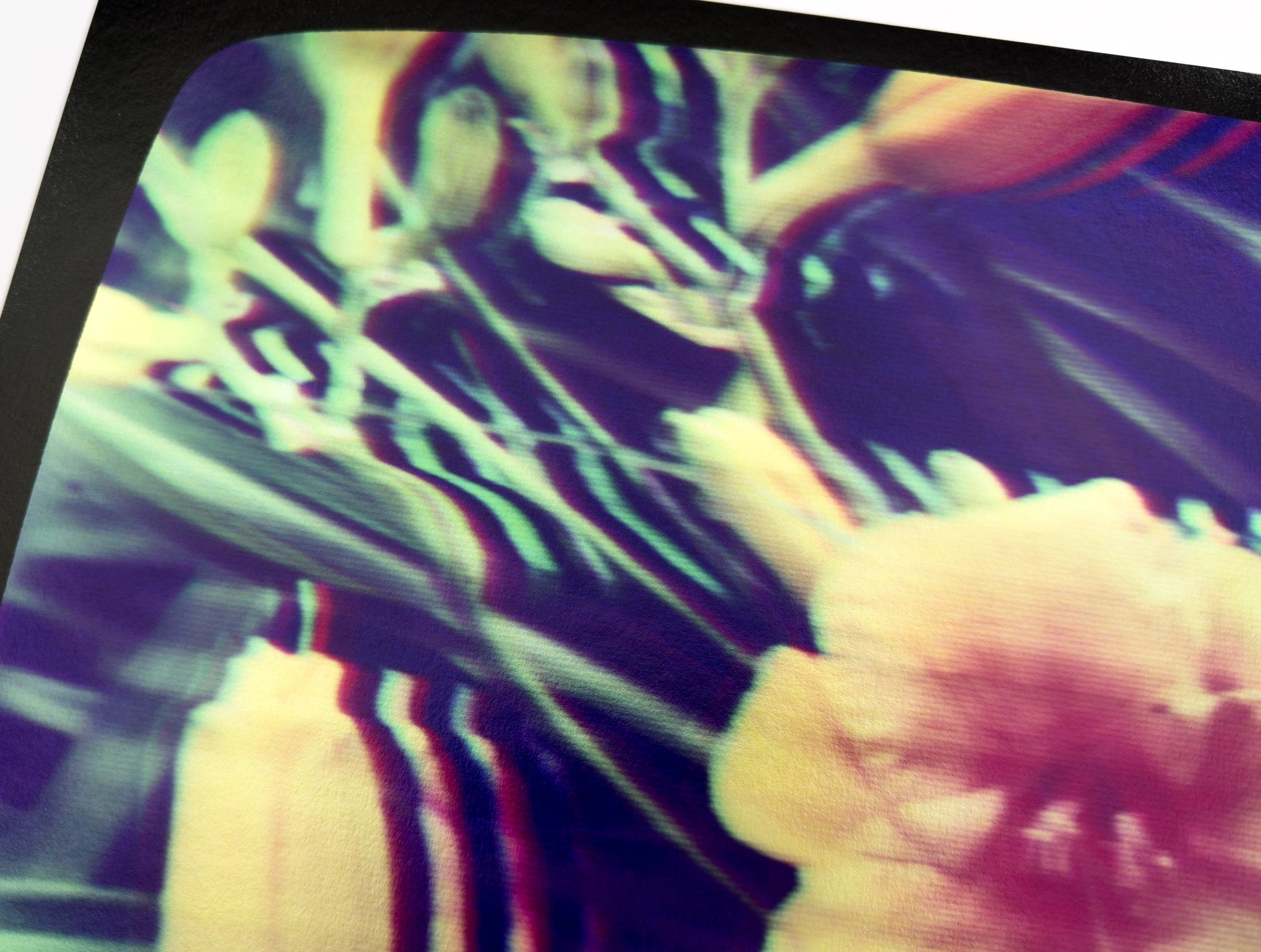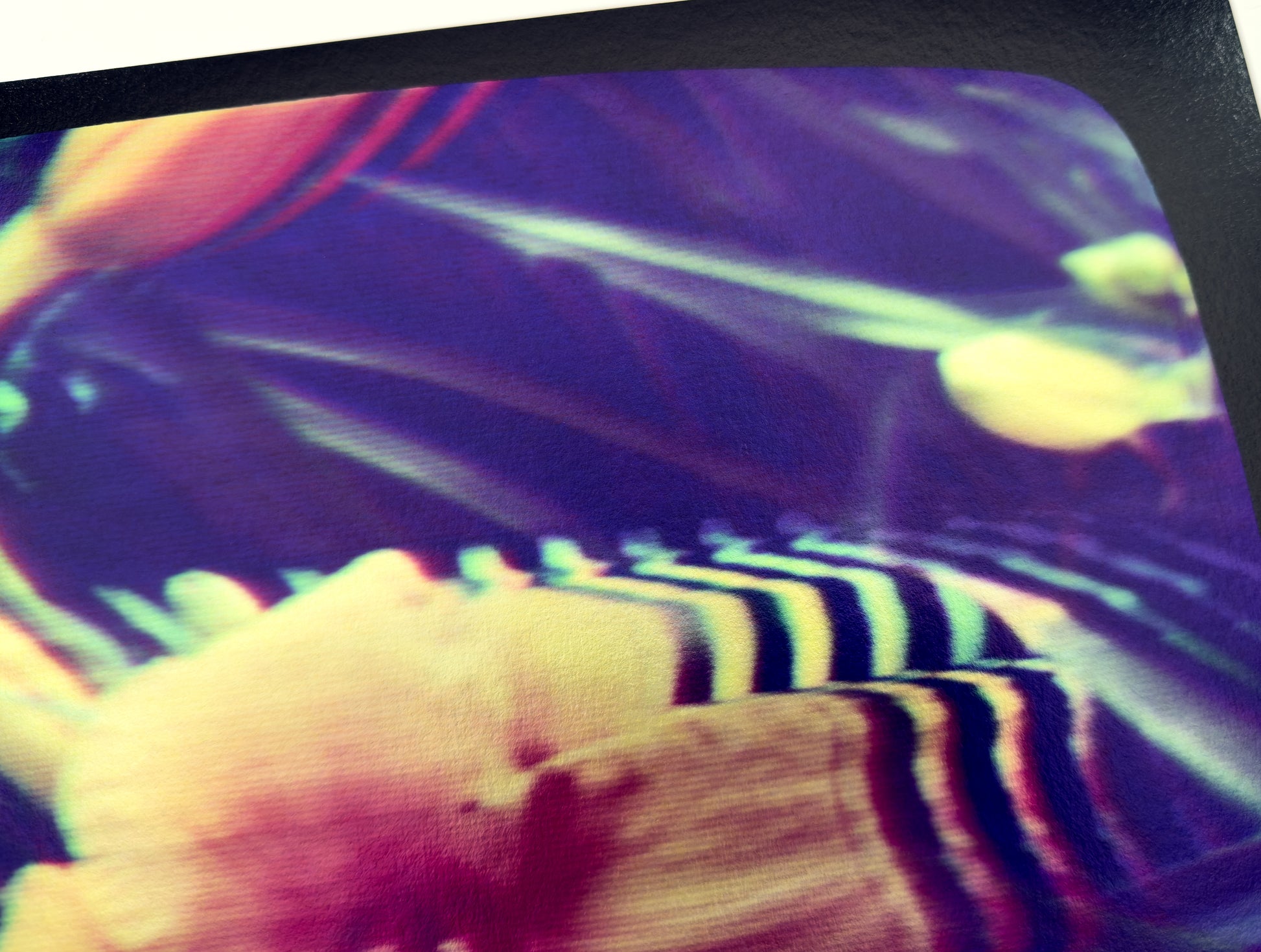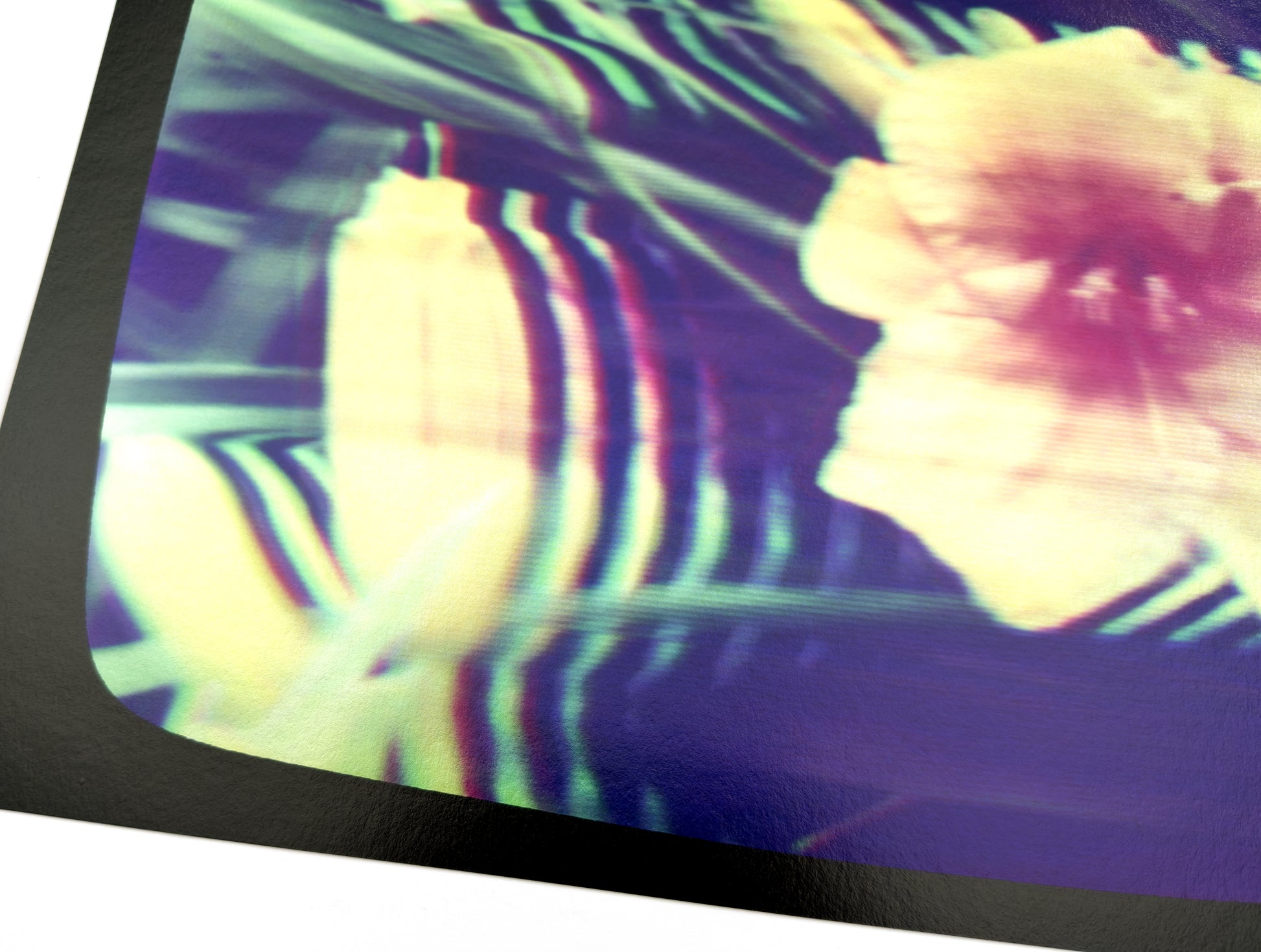 glitch prints are on instax square film, which is similar to classic polaroids. the image is 62mm x 62mm. the border is 72mm x 86mm. the colours will vary slightly, as the glossy finish is hard to photograph. every one is one of a kind, and will not be reprinted.